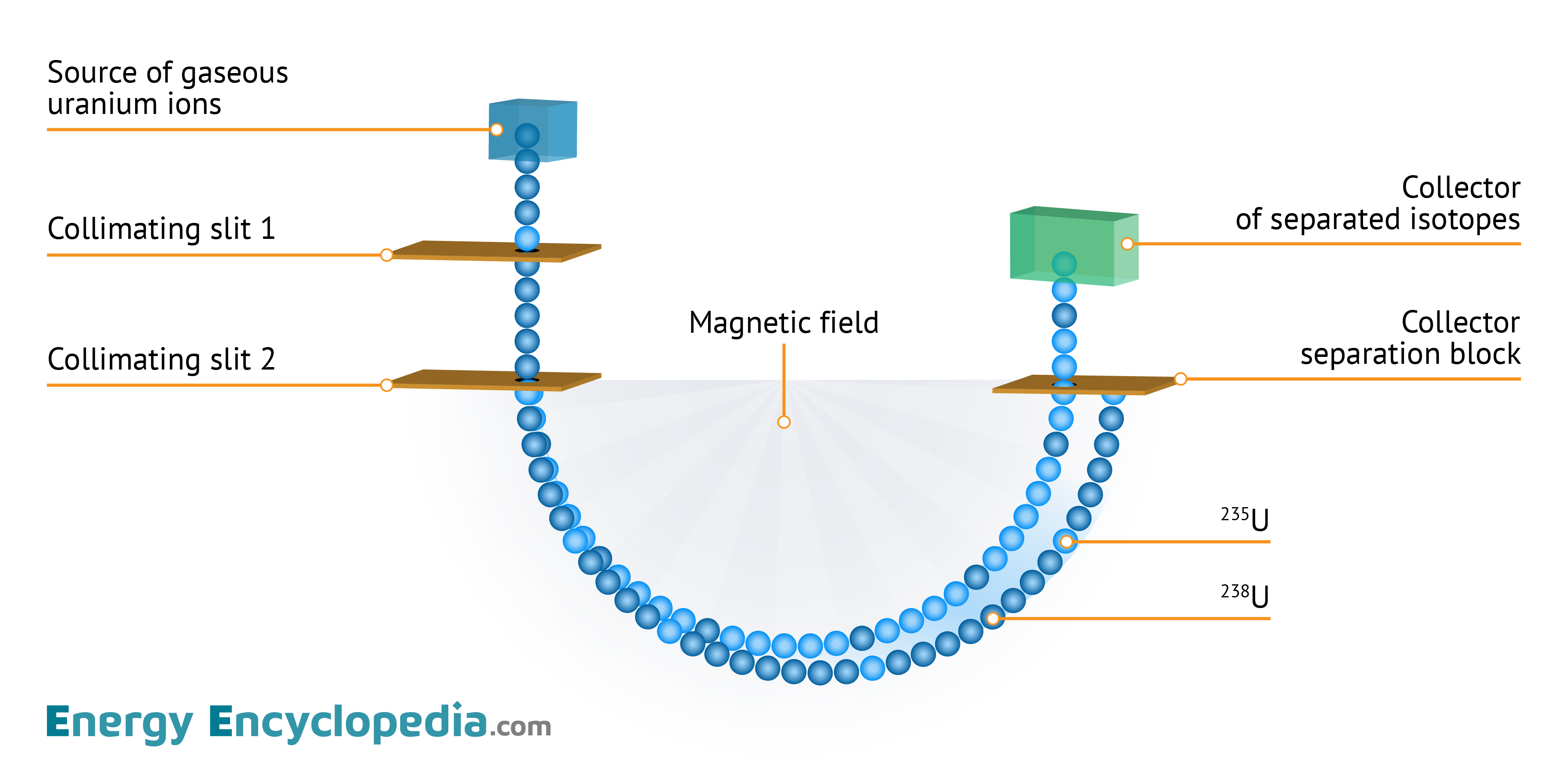 Schematic diagram of calutron which uses a magnetic field to separate uranium isotopes for uranium enrichment.