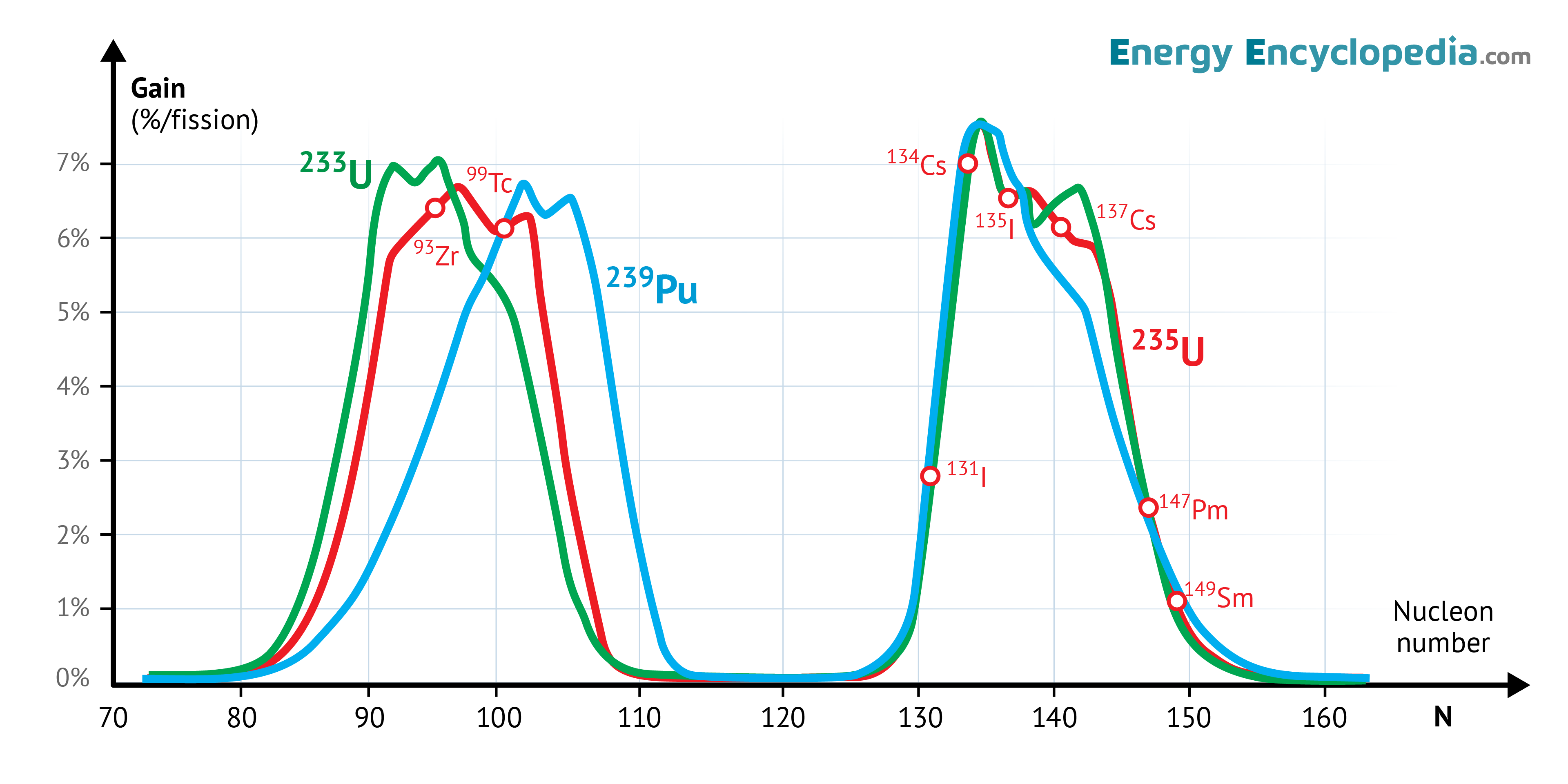Fission products after fission of 233U (green), 235U (red) and 239Pu (blue) by thermal neutrons.