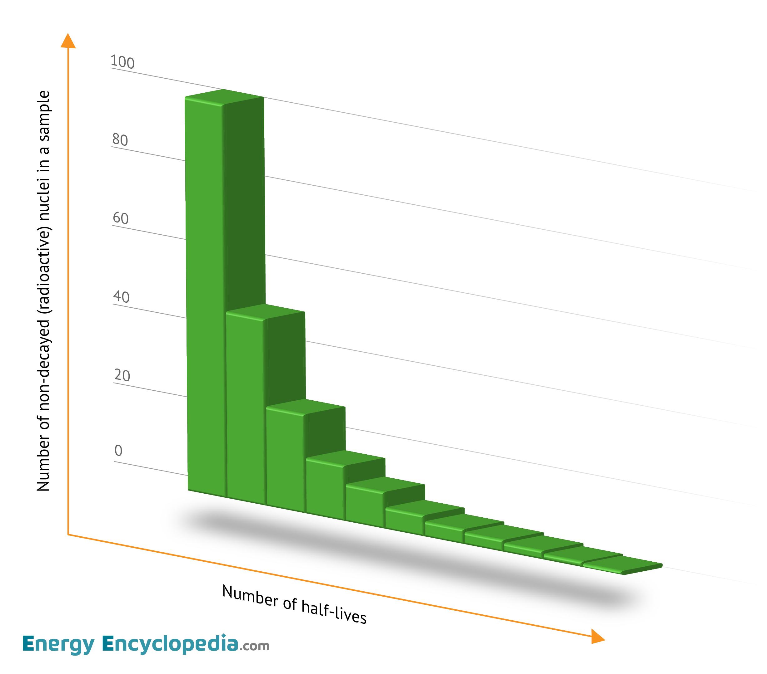 Graph of the decrease in the amount of radioactive isotope in the sample over several half-lives.