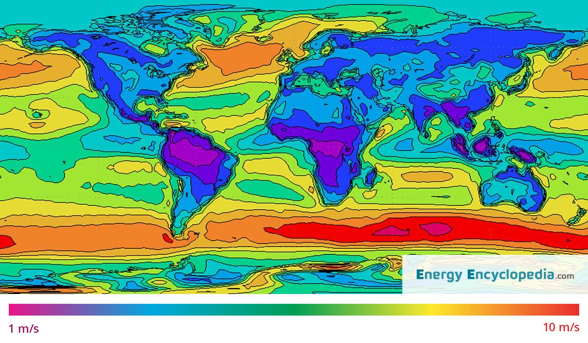 World map of mean wind speed at 10 m above ground level.