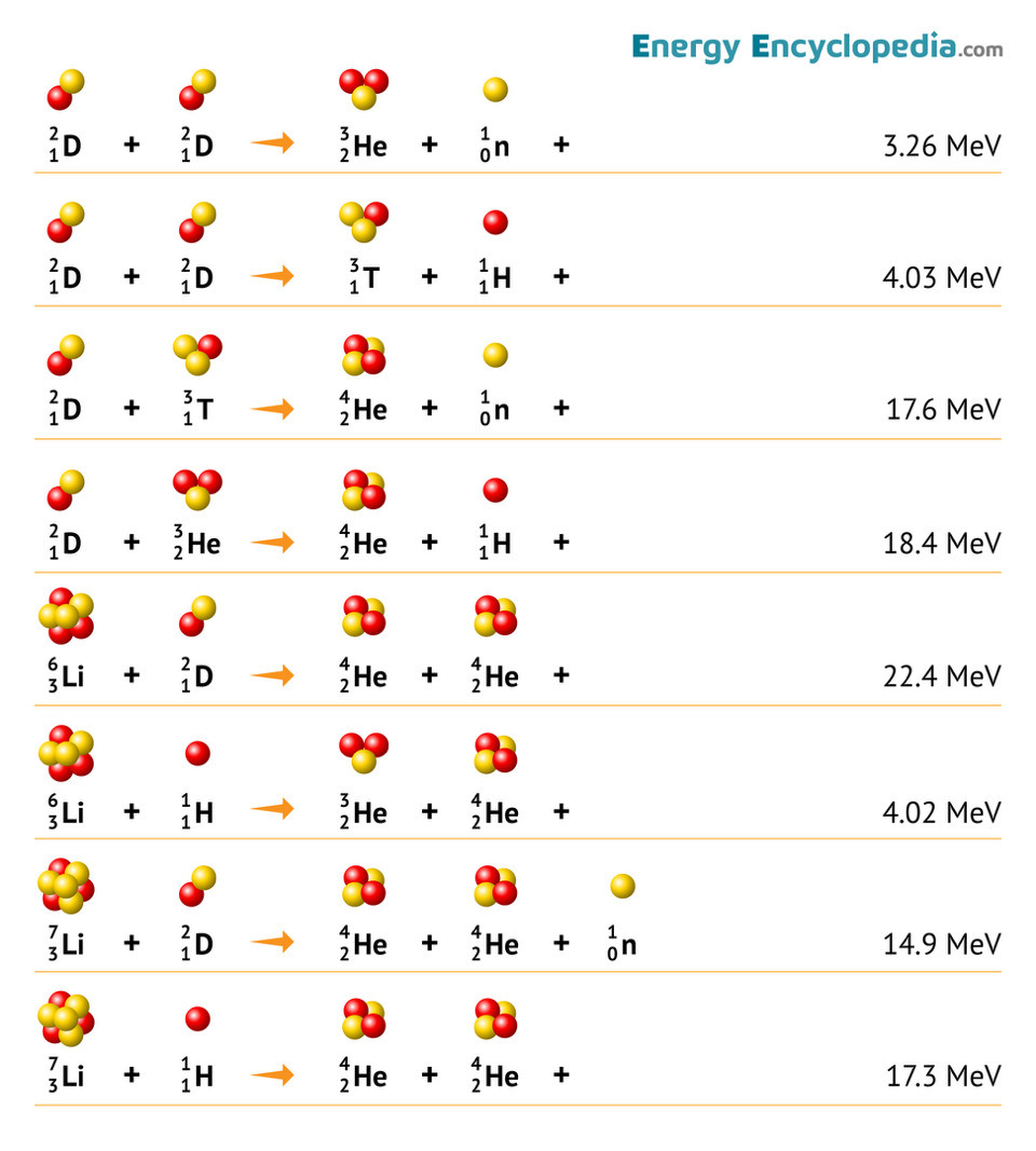 Eight nuclear fusion reactions with fusion products and energy yield.