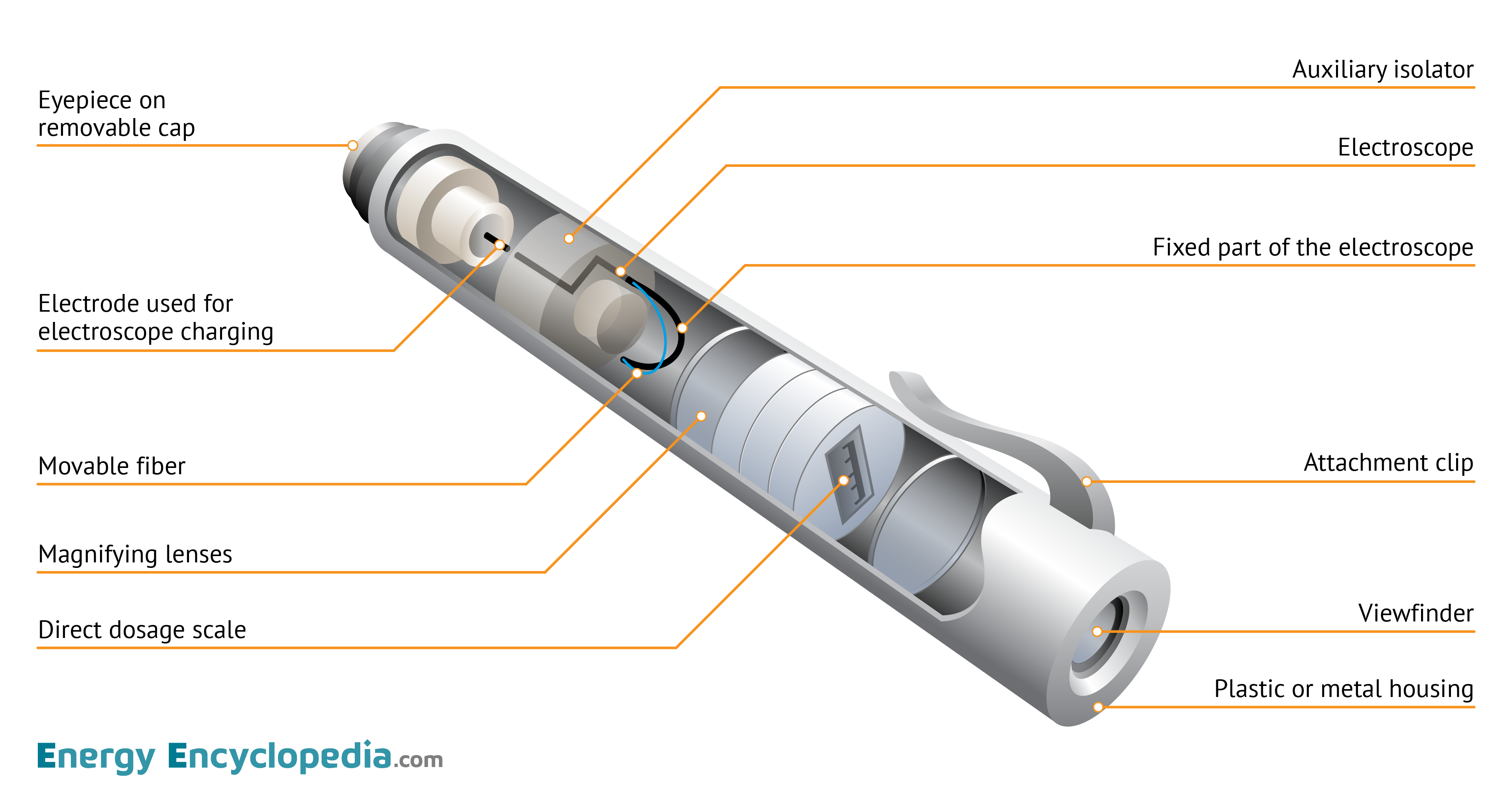 Schematic diagram of a pocket dosimeter which indicates the amount of radiation dose received by the wearer.