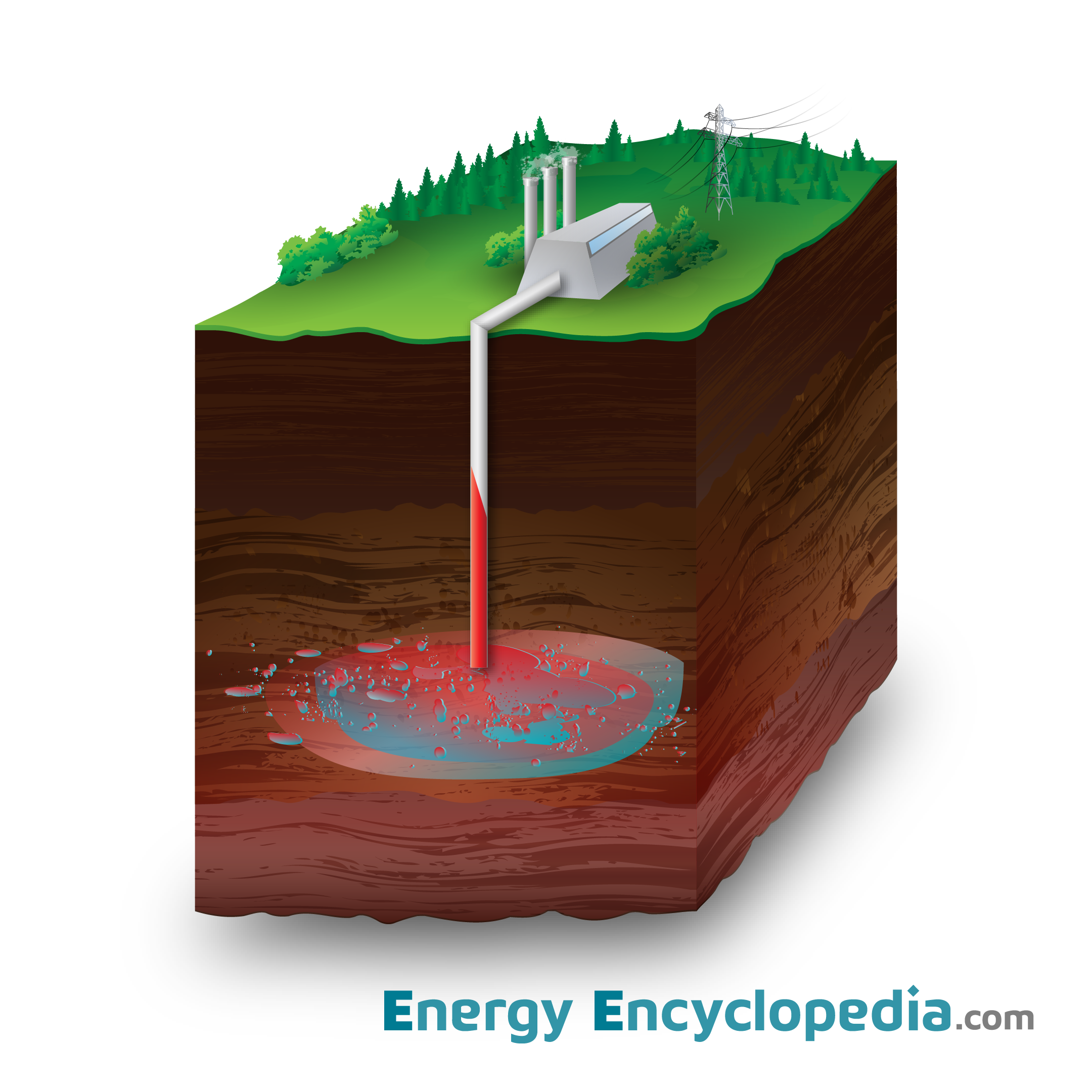 Schematic depiction of Pressurized liquid geothermal power plant system which harnesses the energy of hot groundwater under high pressure.