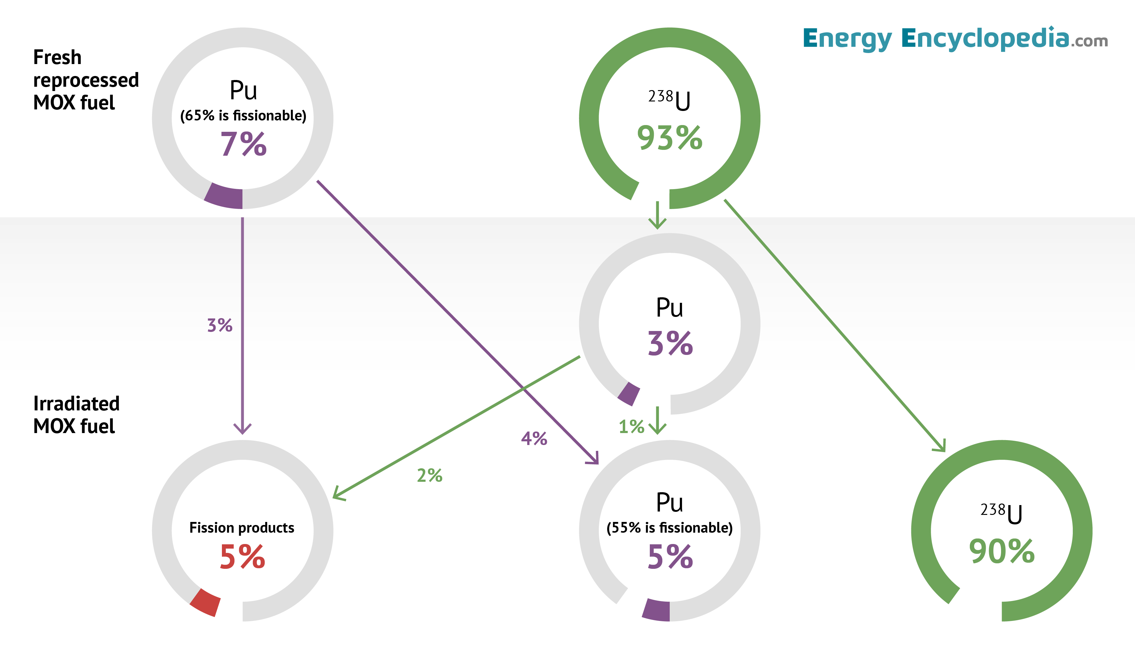 Change of isotope composition in the MOX (mixed uranium - plutonium oxide) fuel after irradiation in the nuclear reactor.