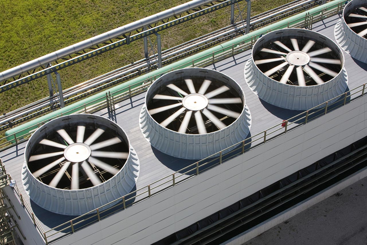 Structures designed to dissipate heat from the cooling circuit to the atmosphere. In order to maximize the energy conversion, the steam has to be condensed when exiting the steam turbine. This is done by a special cooling circuit; usually the tertial. There are two basic types of cooling towers. A forced draft tower uses fans to blow air through the sprayed water, which is cooled by evaporation. Natural draft towers have the shape of a rotating hyperboloid and are pre-stressed concrete structures up to 200 metres high. Air is naturally drawn in at the base of the tower. The water is sprayed at one fifth of the tower height and falls into a pool below the tower when it cools down.