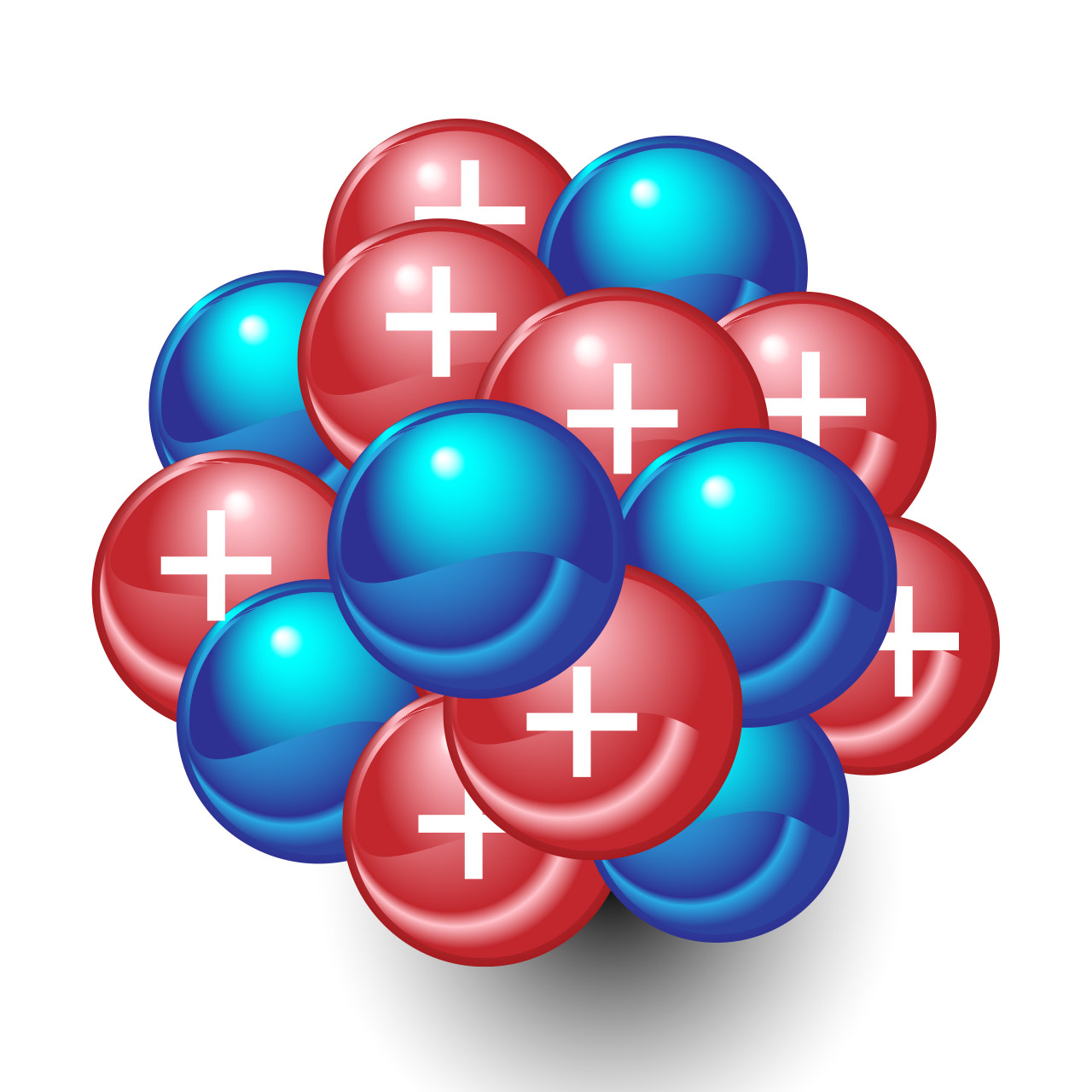 The atomic nucleus is composed of protons and neutrons. The number of protons uniquely identifies the individual element, for example, the number of protons in the nucleus of oxygen is 8 (this is called its “atomic number”) and uranium’s is 92. Since the masses of the proton and the neutron are nearly equal, the total number of protons and neutrons in an atom’s nucleus is called its “mass number” and tells us approximately how much hydrogen it would take to weigh the same as this atom. Atom with the same number of protons, but a different number of neutrons, belong to the same element but are known as isotopes (for example oxygen has 3 stable isotopes the most common being 16O). The isotopes of an element exhibit the same chemical properties but differ in their physical properties.