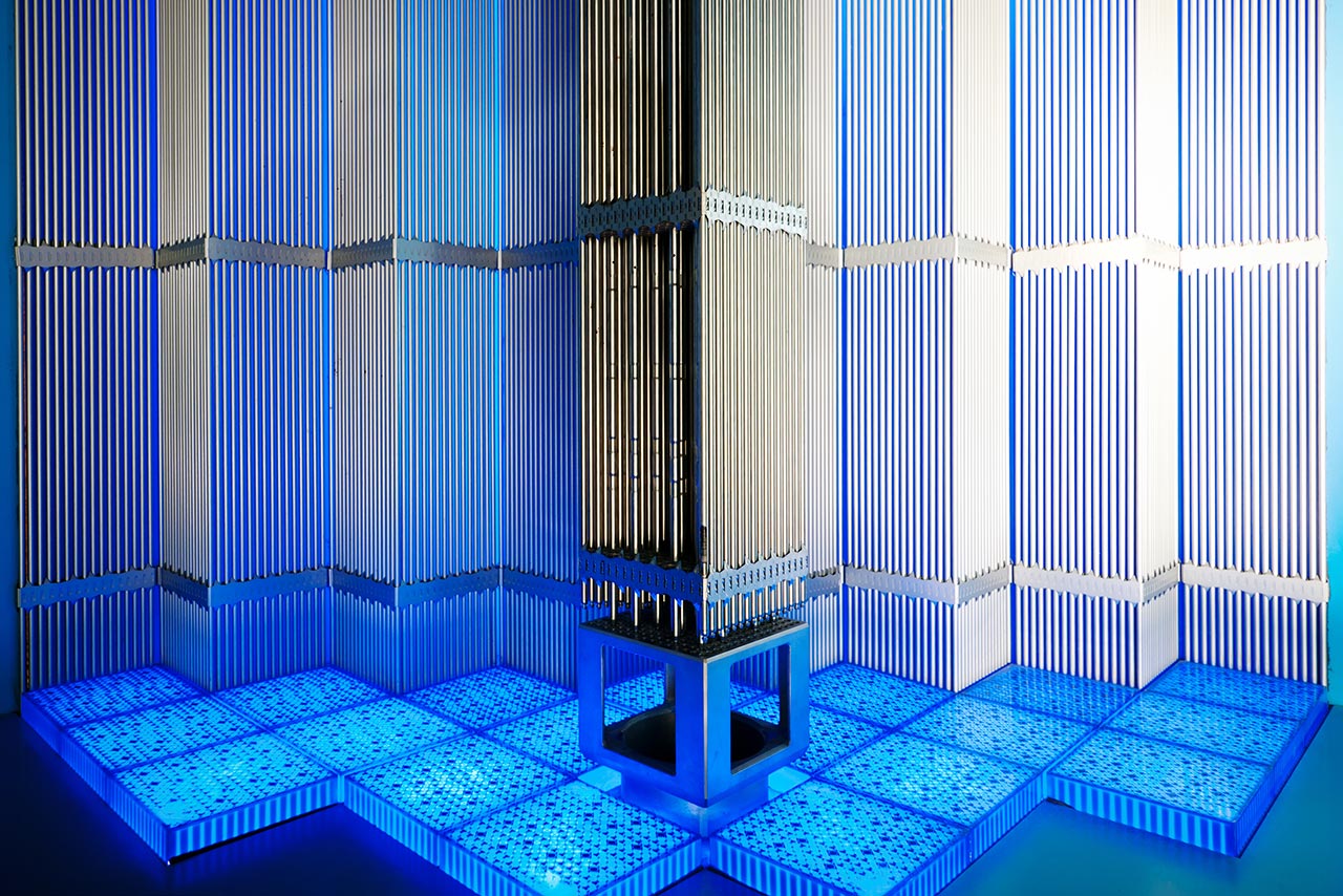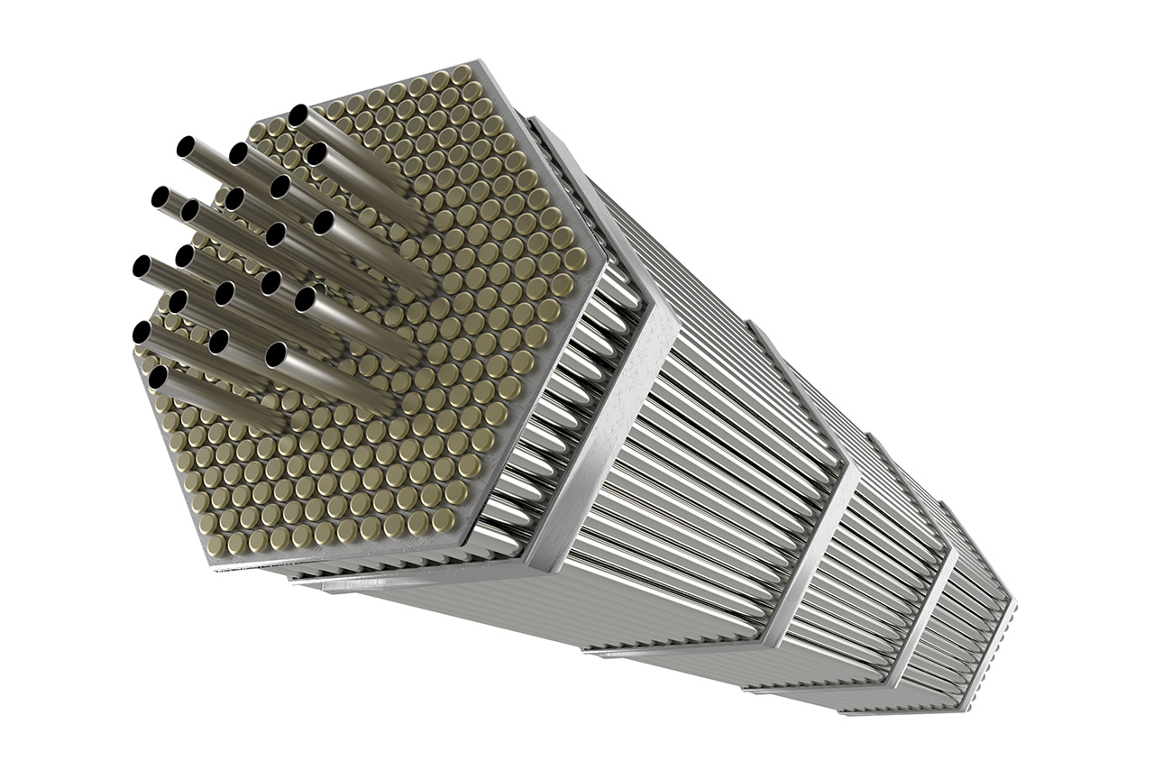 Absorber rods are contained in assemblies of the VVER 1000 type pressurized water reactors; they are evenly spaced in between the fuel assemblies. They move inside protective tubes.