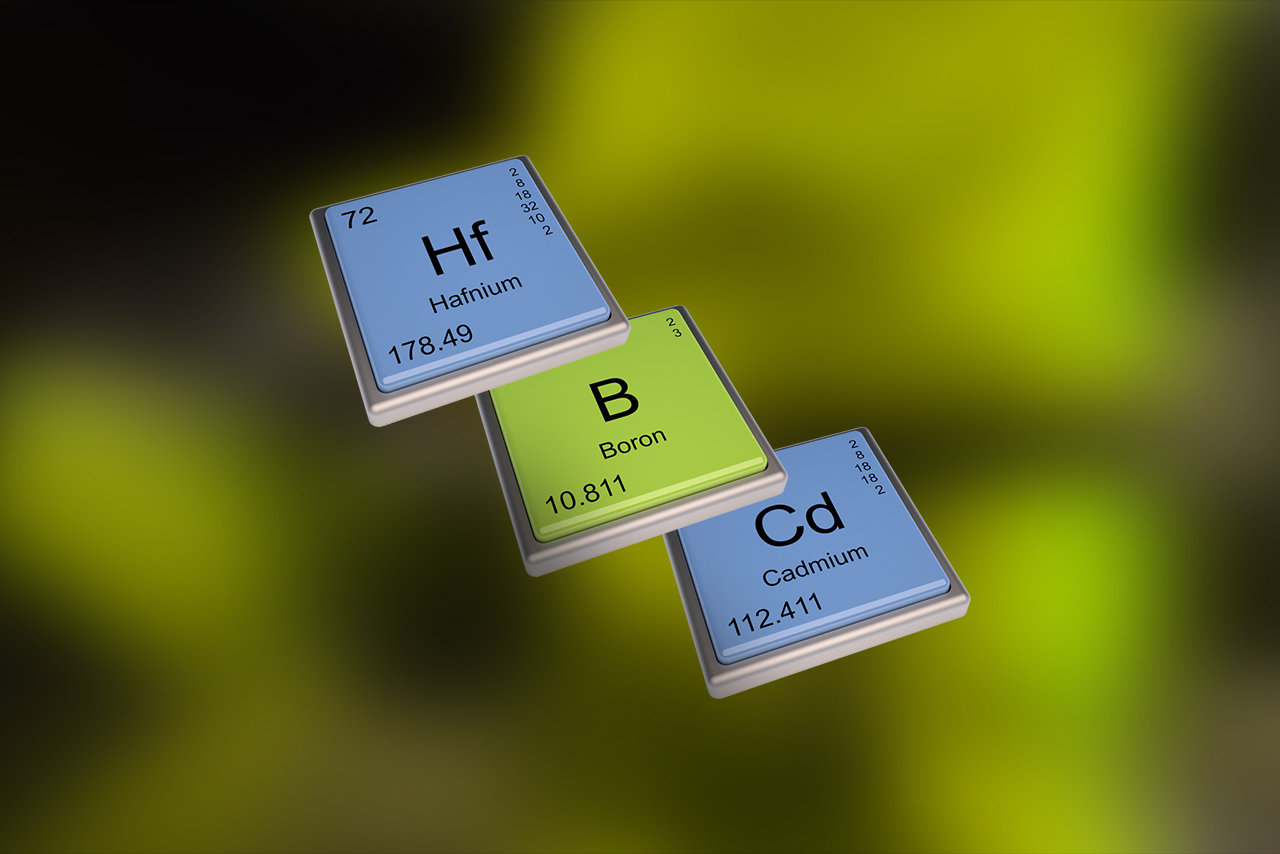 Control rods (also called regulating rods) made of steel alloyed with boron and containing cadmium or hafnium are inserted in between the fuel bundles in a nuclear reactor. The absorber concentration is decreased by pulling the rods out of the reactor core, causing the reactor power to increase. Inserting more control rods causes the reaction to be inhibited and the power output decreases. In some types of reactors, the upper part of the fuel bundles is made of an absorbing material. The depth of the fuel insertion into the reactor core controls the reactor power.