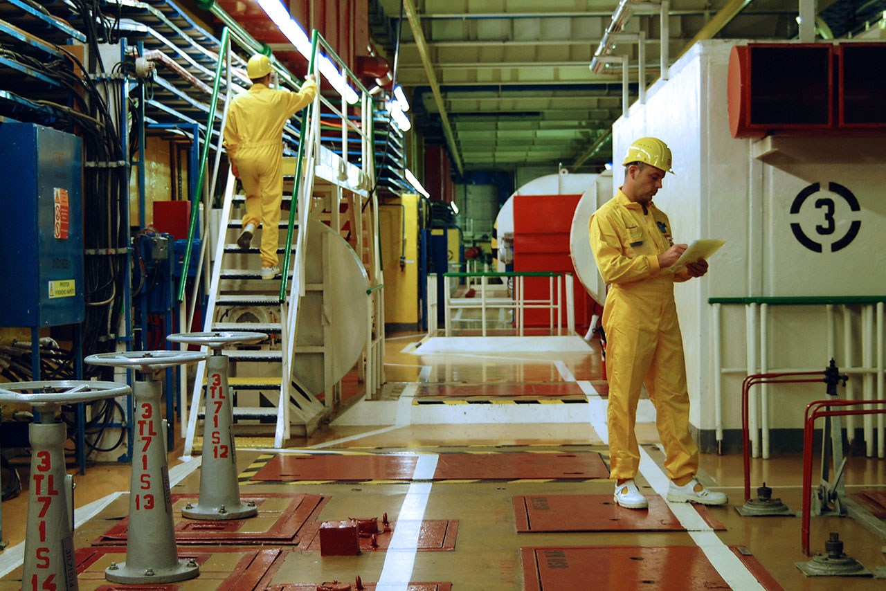 Under favorable conditions, fully under the control of the power plant operators, a controlled fission reaction takes place inside a reactor core. During this reaction, energy is generated by the fission of atomic nuclei primarily in the form of heat. This heat is removed from the fuel rods by means of a coolant. Water is the most commonly used coolant. Less frequently, molten metal or gas can be also used. The coolant temperature is about 300 °C when it exits the reactor. The actual reactor is a steel or concrete vessel or just a set of channels housing the nuclear fuel. A reactor must be able to withstand high temperatures and pressures and a strong neutron flux. The estimated service life of a reactor is about 60 years.