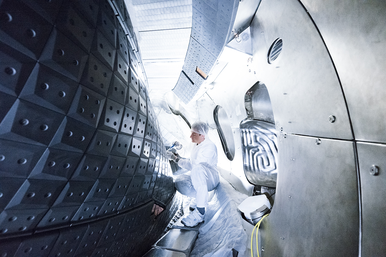 Since stellarator plasma has the shape of a twisted ribbon with a changing bean-like cross-section, the vacuum vessel that encloses it also has a strange and irregular shape. You can imagine it like a hollow steel donut that has been randomly squashed by a giant hand in some places.