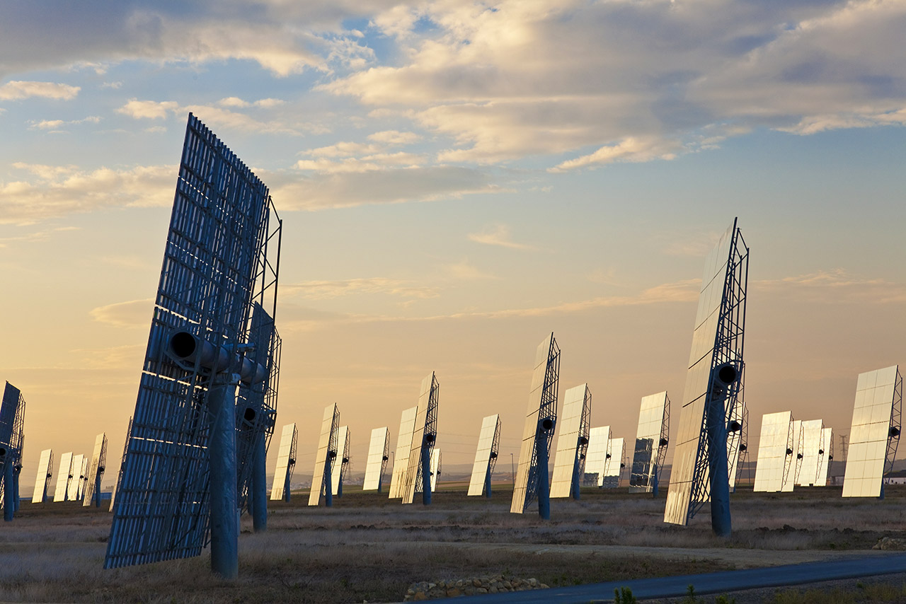 An array of heliostats continuously concentrates the sunlight to the flat absorber at the top of the tower.
