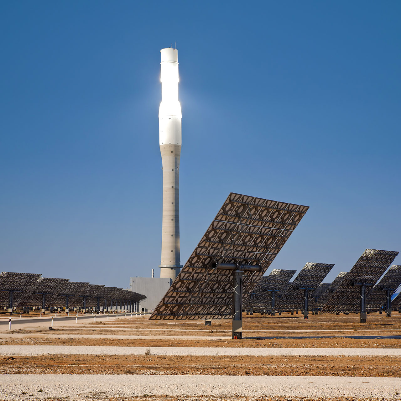 Central tower solar power plants fall into the category of concentrated solar systems. They concentrate solar radiation from a huge area into a very small space on top of a tower. To achieve that, they use flat mirrors, called heliostats, which are distributed around the tower with the absorber. A computer continually calculates the Sun’s position in the sky and adjusts the heliostats every few seconds to track it, to ensure the reflected light stays aimed at the top of the tower.