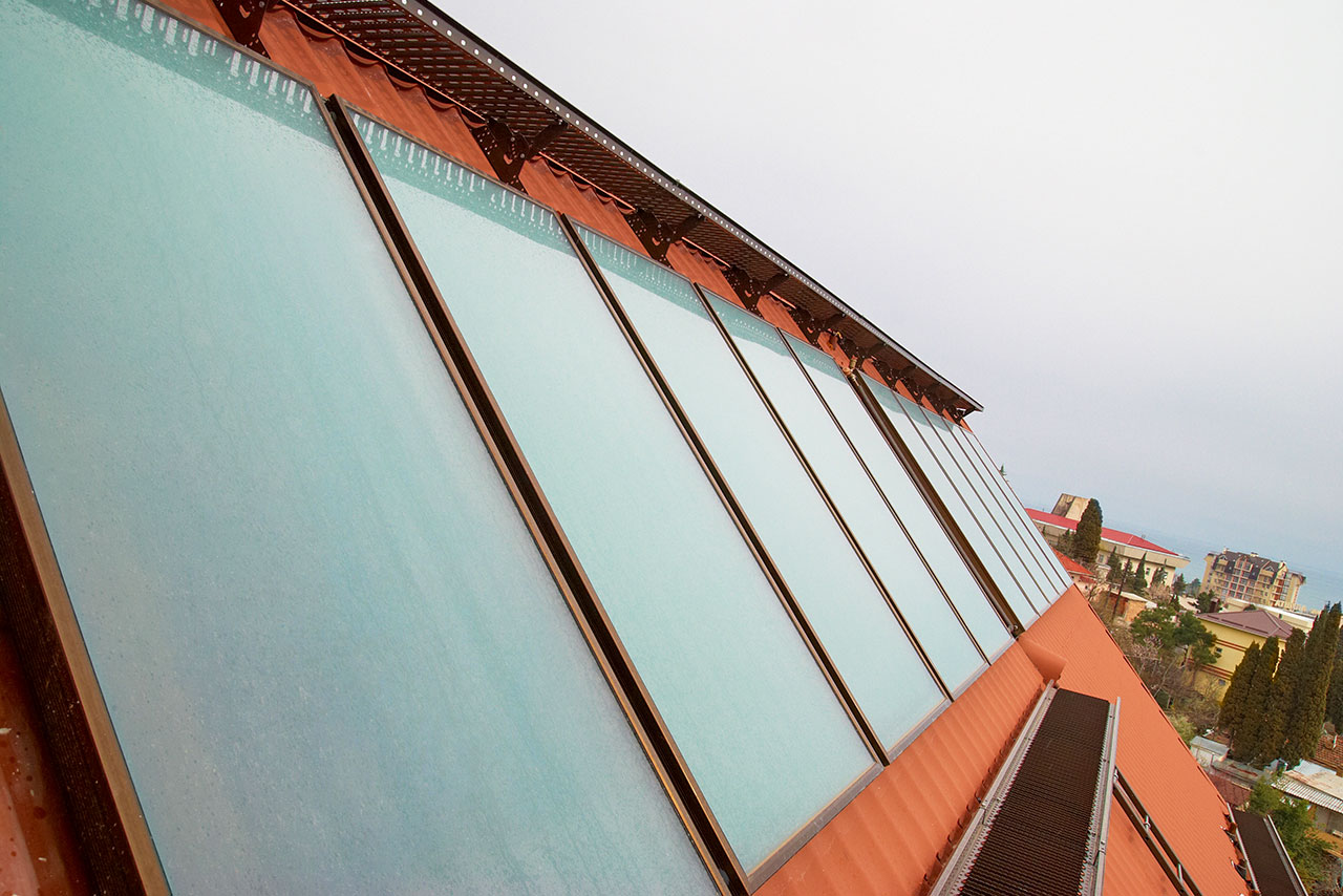 A flat plate collector power output depends on many factors. The main factor is the amount of solar energy falling on the surface of the collector. To achieve maximum gain, a collector should be irradiated all day long, facing the right direction and the surface should be perpendicular to falling sun rays. A southerly to south-westerly orientation is ideal. The inclination should be set with respect to the Sun’s path in different seasons, or it should be variable. In central Europe, the best yield is reached at 20 to 30 degree inclinations in summer and at 60 degrees in winter. In practice, variable inclination is not used very often. Collectors are inclined to maximize output at transitional periods that means approximately 50 degrees in central Europe.
