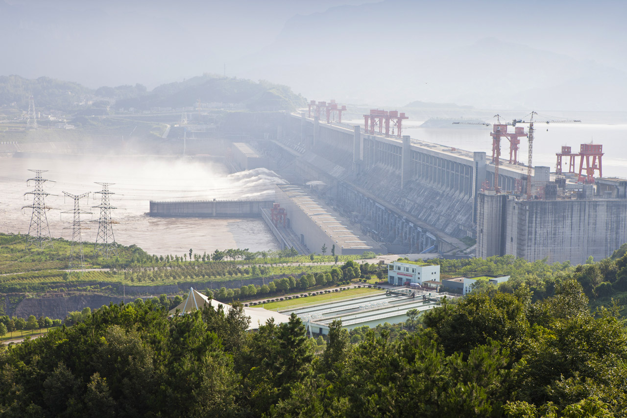 The construction of the largest hydroelectric power plant in the world, the Three Gorges Dam on the Yangtze River in China, started in 1993. Thanks to its size, it is considered a modern equivalent to the Great Wall of China. The dam is 181 meters high and 2,335 meters long. In addition to its energetic use (its installed capacity of 22,500 MW should cover 10% of the demand of China), this dam protects adjacent regions from floods while improving conditions for shipping. But aside from its indisputable benefits, this structure also has a negative impact on its environment. 1.24 million People (150 cities and 1,350 villages) had to be relocated during the filling of the reservoir and some archaeological sites were lost to the water too. The huge water mass has a considerable impact on its environment. The valley slopes suffer from frequent large scale landslides while mud and waste builds up on the bottom of the lake.