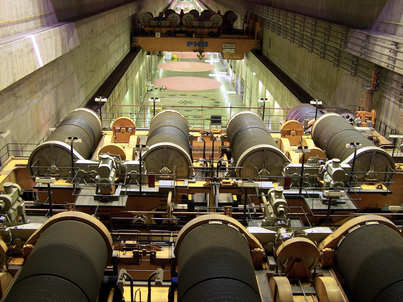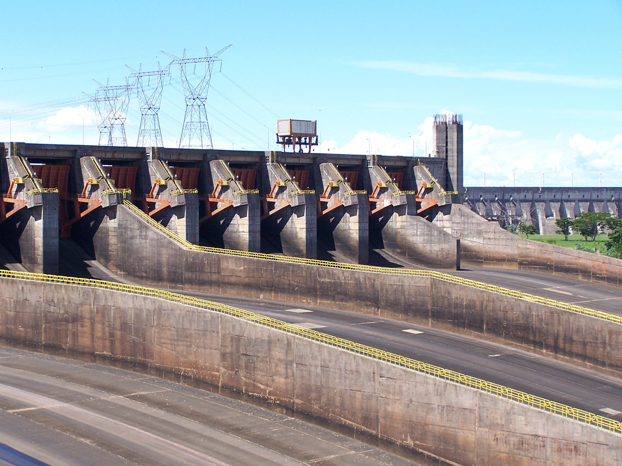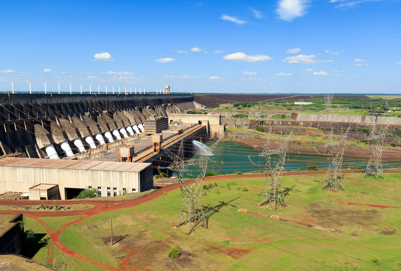 Before the “Three Gorges Dam”, the Itaipú hydroelectric power plant on the Paraná River was the largest in the world (now second). It lies on the border between Paraguay and Brazil and has supranational company status so it is not owned by any of the two countries. It was completed in the eighties of the last century. The construction took nearly 14 years. The dam is 196 meters high and 7,919 meters long. The installed capacity of all 20 turbines is 14,000 MW total. When full, the water level of the reservoir is 100 meters above the level of the original river. The power plant covers approximately 20% of the yearly demand of Brazil and practically all the demand of Paraguay.