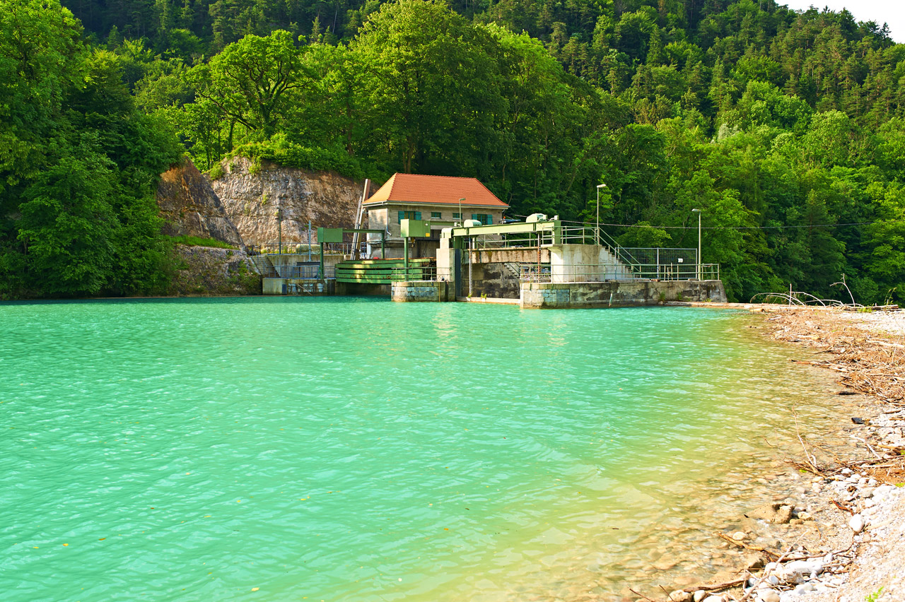 The principle of a derivational hydroelectric power plant lies in diverting a part of a river into a derivation canal that is significantly less steep than the original river bed. The diversion is achieved using barrages or dams with sluices. The power plant that makes use of the head between the diverted water and the river is usually several kilometers away from the barrage or dam. If the canals are open and lead along terrain contour lines, we speak of an unpressurized derivation. In the case of a pressurized derivation, the water feeding the turbines is led in a penstock or an underground tunnel. After leaving the turbine, the water returns to its original riverbed. Seasonal changes and varying environmental conditions strongly influence the power output of these types of plants.